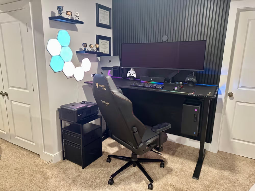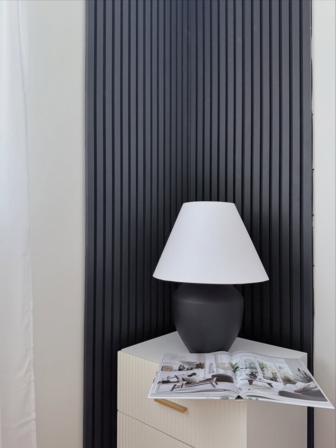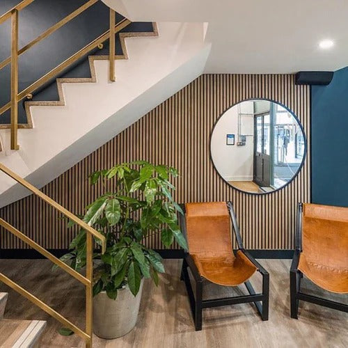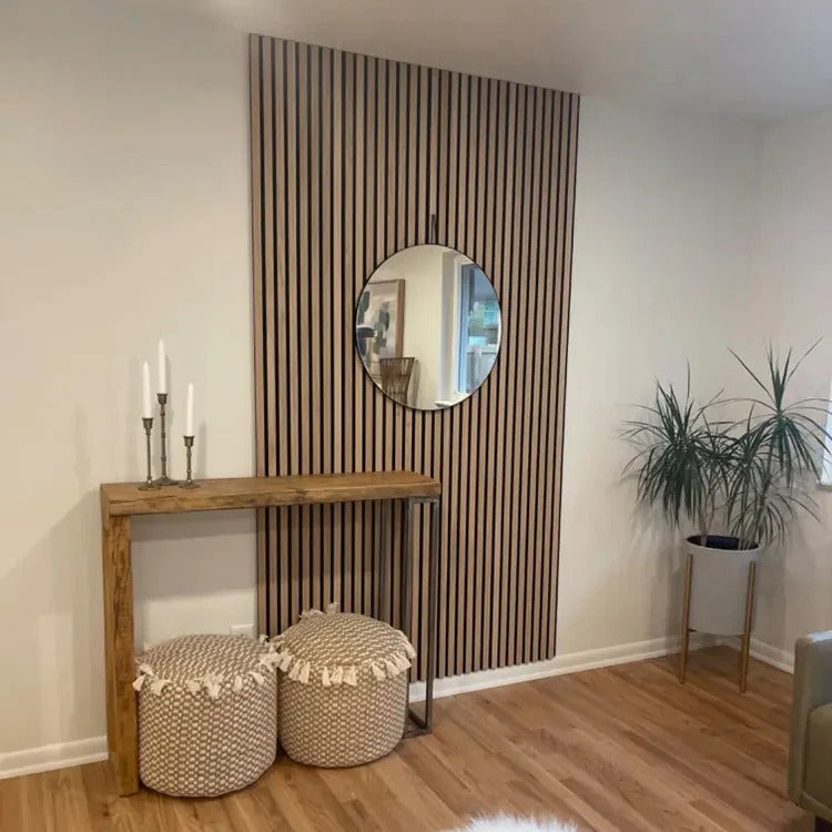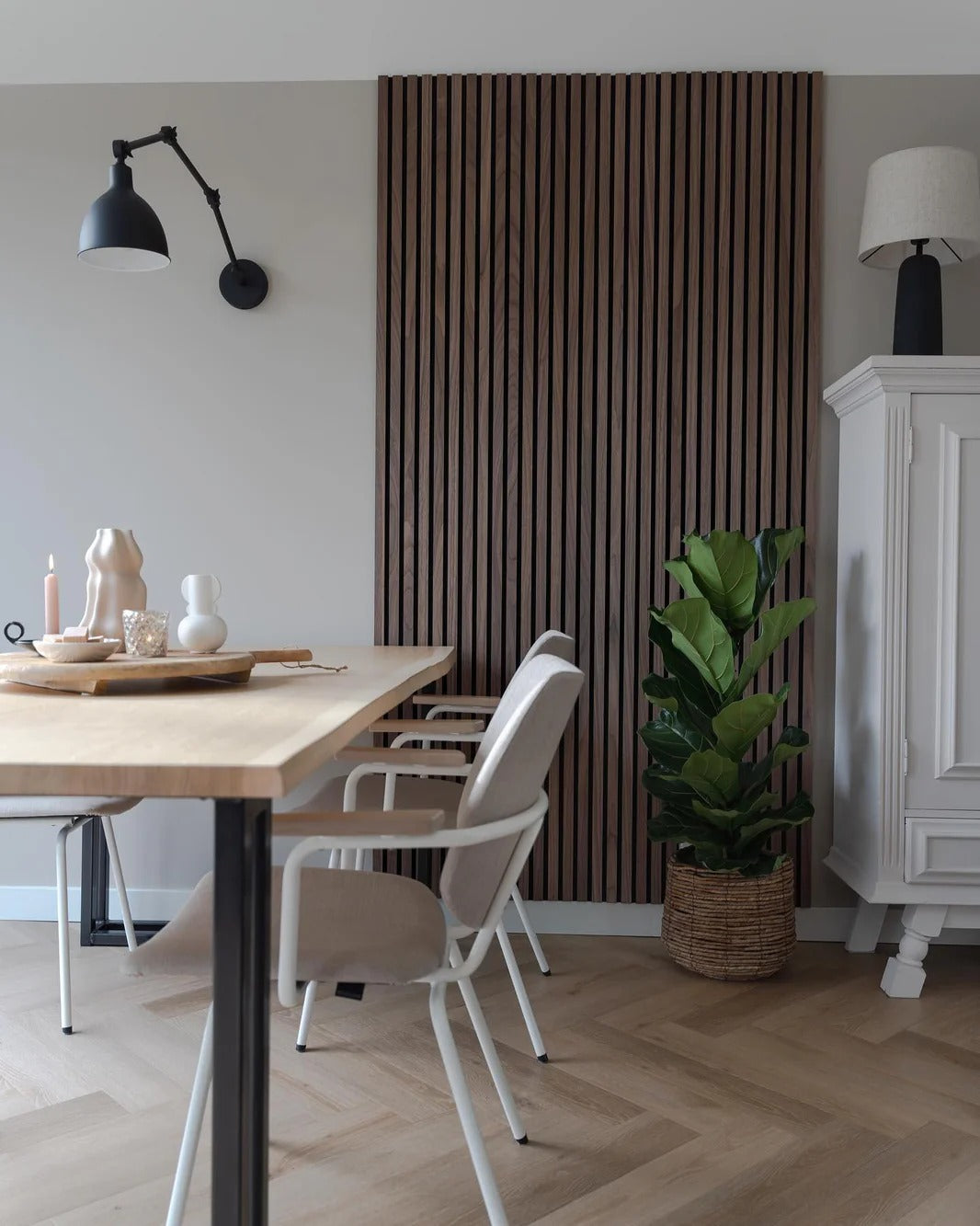 These luxurious black oak panels add to our home office the perfect balance of texture and tone. The slats feel fresh and natural, while the gray felt backing adds depth and a calm elegance. Installation was easy and the panels instantly improved the appearance and acoustics of the room. It now looks like a professionally designed space – cozy, modern and fully functional.
